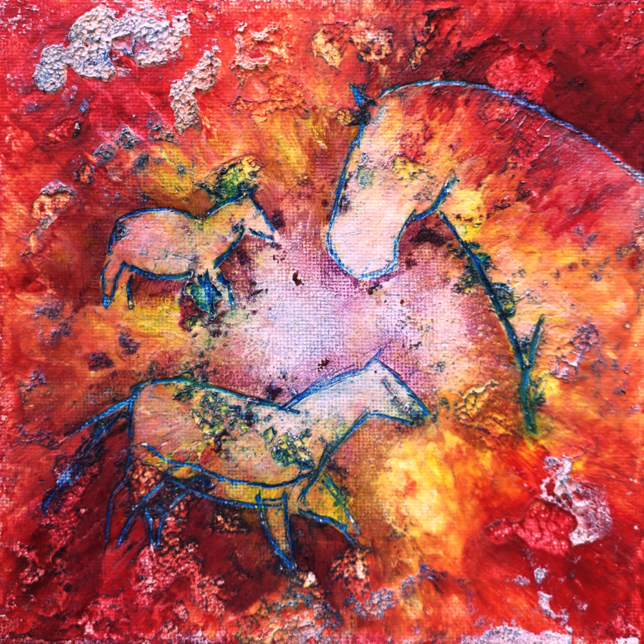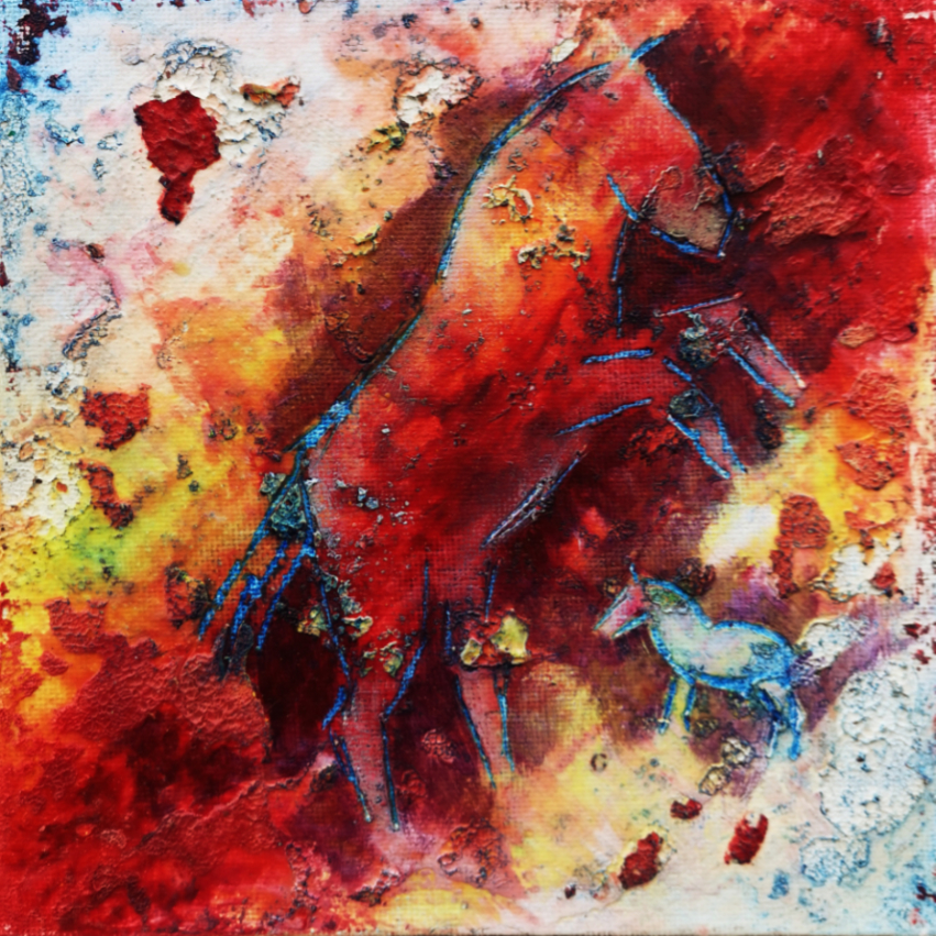 Working in acrylic and oils on canvas, pieces are distressed, revisited and repainted several times until the result satisfies her vision – with each layer of process visible in the final piece. She also experiments with manipulating wax and oils with scratched designs based on prehistoric cave paintings.